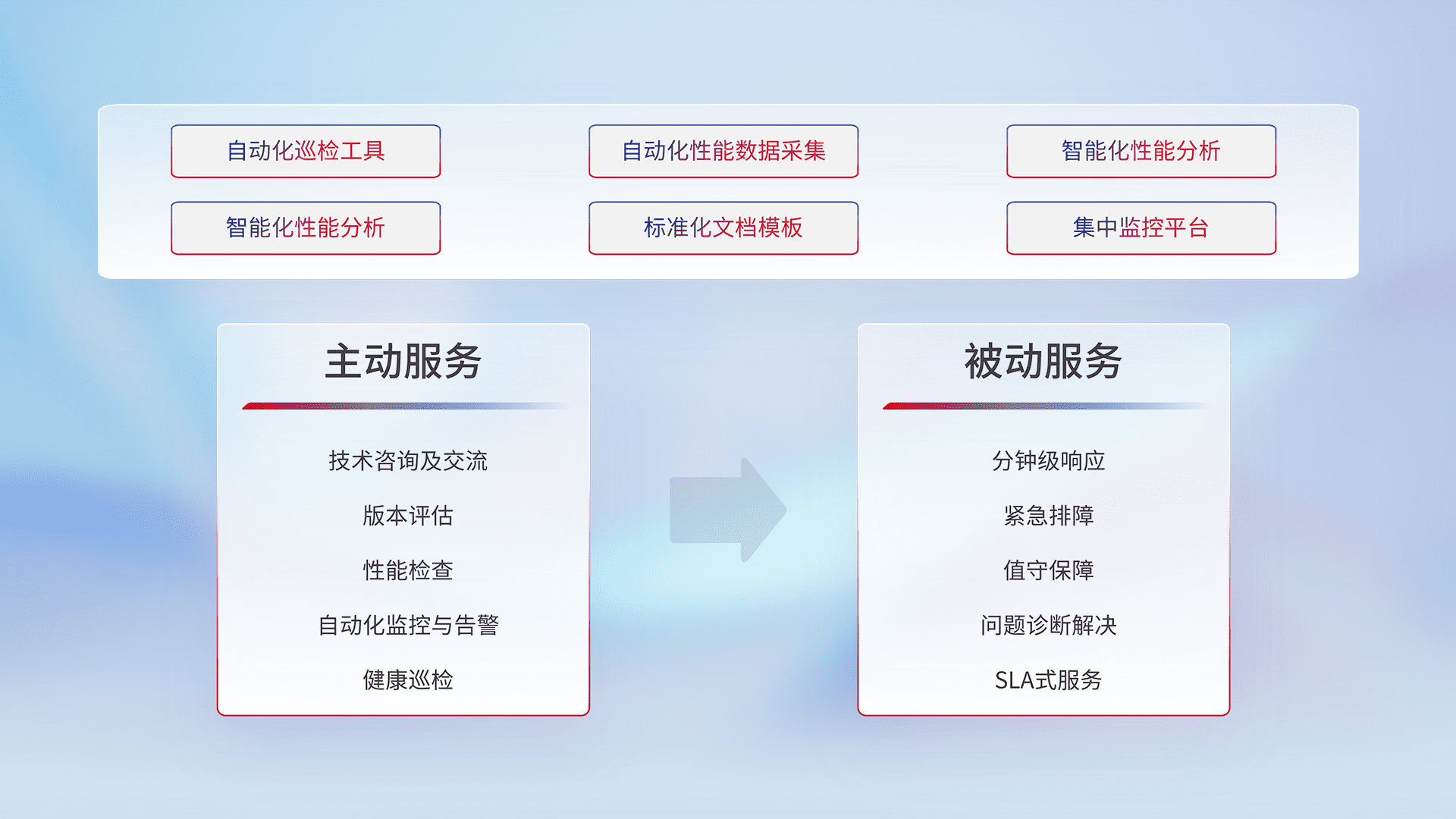 智能化工具和标准化文档,,,,保障服务质量,,提供主动服务(包含技术咨询、、版本评估、、、性能检查、、、自动化监控与告警、、健康巡检)和被动服务包含(分钟级响应、、、、紧急排障、、、值守保障、、问题诊断解决、、SLA服务)。。。。